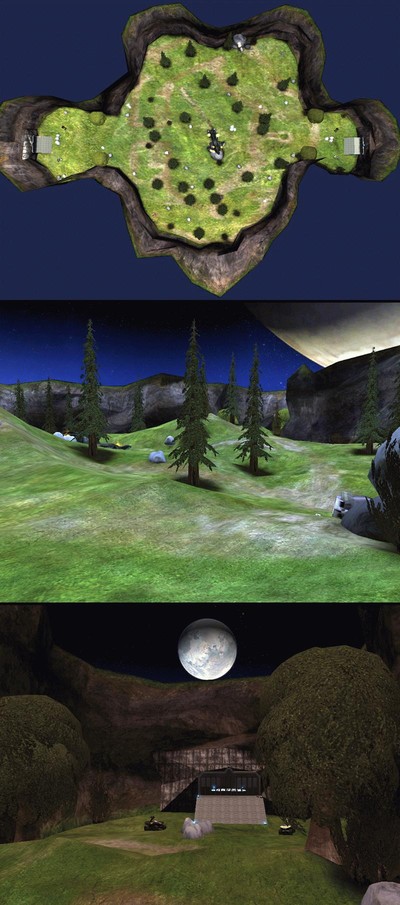 A large hilly and tree dotted terrain separating two bases accessible only on foot