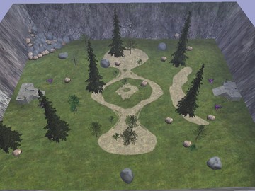 A small box canyon map, with a landslide in one corner of the map and two bases